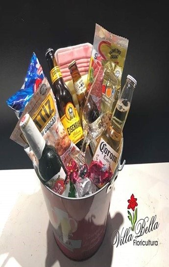 01 amendoim, 01 castanha, 01 batata ruffles, 04 cerveja log neck, presunto e mussarela, 01 salame, 02 bombons, 01 taça, 01 balde de cerveja ou baú pequeno.