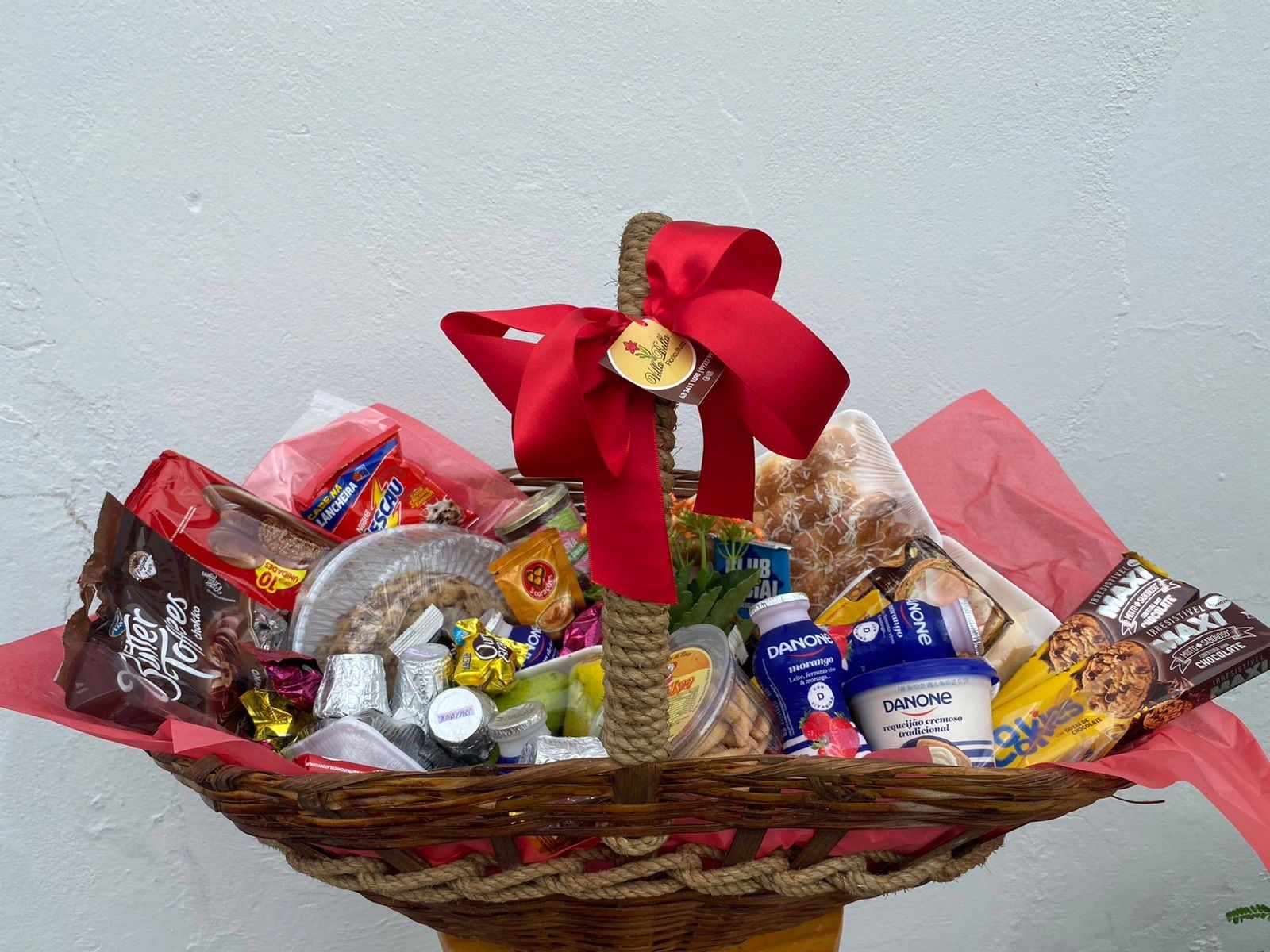 pãezinhos, presunto e mussarela, patê, 02 achocolatados, 02 sucos, 05 frutas, biscoito doce, biscoito salgado, 02 iogurtes, 1 bolo, torradas, 2 vitaminas, 2 cappuccino, polenguinhos, requeijão cremoso, rosquinhas, geleia, pão de mel, 4 barras de cereal, 2 cookies, 1 caixa de mini sucrilhos, 1 pacote de balas sortidas, 2 água de coco, 2 bombons recheados, 2 bombons, 1 vaso de flores naturais, cesta decorada