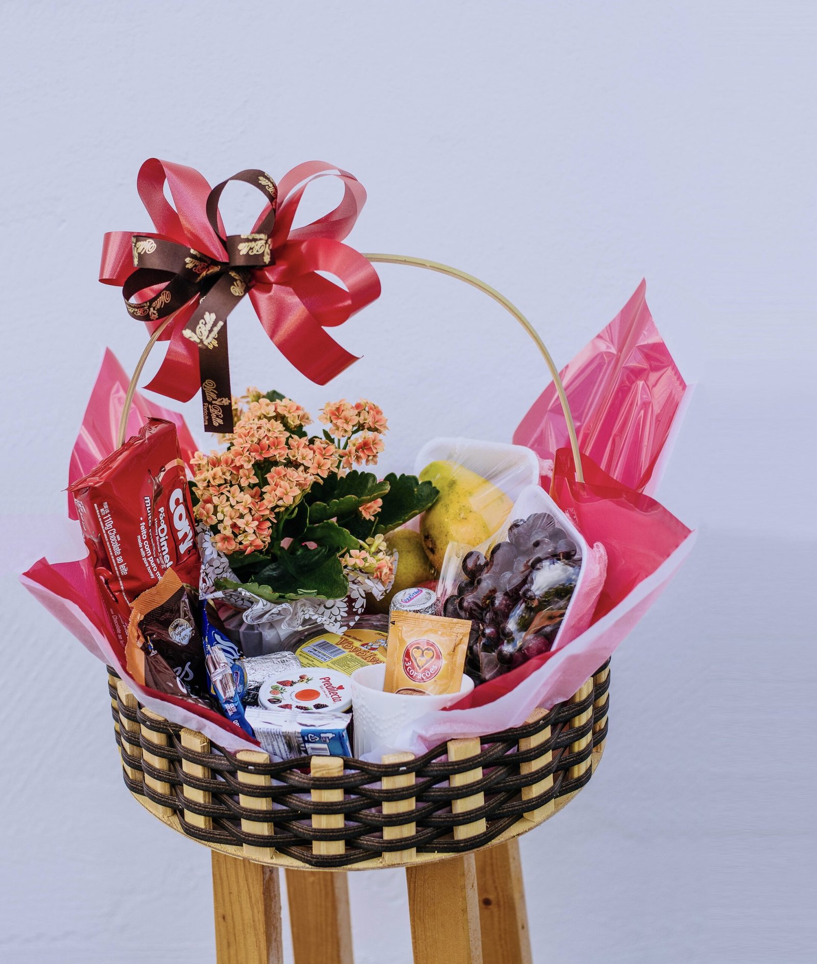 01 vaso de kalanchoê, 04 frutas, geleia, 02 bombons, mini sucrilhos, biscoito doce, biscoito salgado, caneca, café cappuccino, balas variadas, pão de mel, cesta decorada.