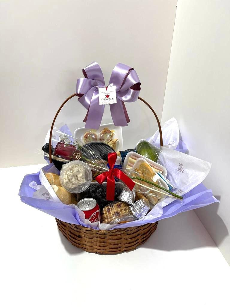 Pãezinhos, presunto, mussarela, patê, 01 refrigerante, 01 suco, 04 frutas, biscoito doce, biscoito salgado, 01 iogurte, 02 bombons, 01 bolo, torradas, 01 botão de rosa, salgadinhos, cesta decorada.