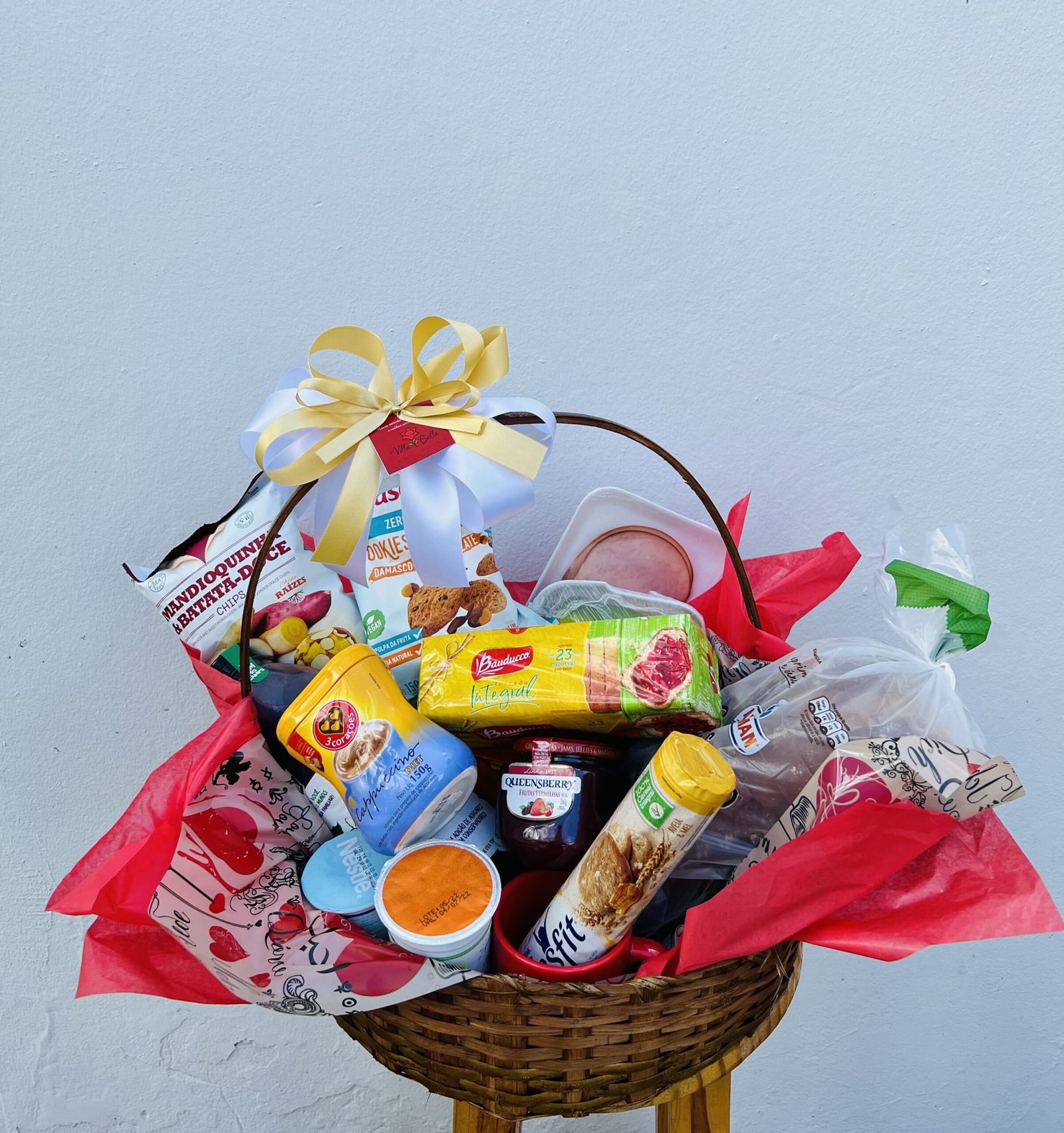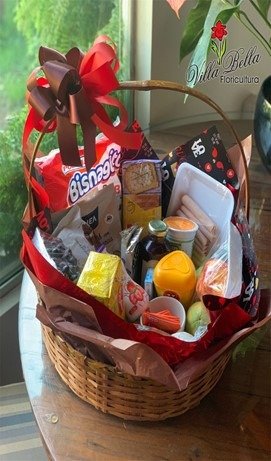 01 suco integral de uva, chá matte, iogurte natural, geleia diet, pão integral, queijo branco, peito de peru, caneca, cappuccino ligth, torrada ligth, torrada integral, água de coco, biscoito doce, biscoito integral, 04 frutas, cookies diet, cesta decorada.