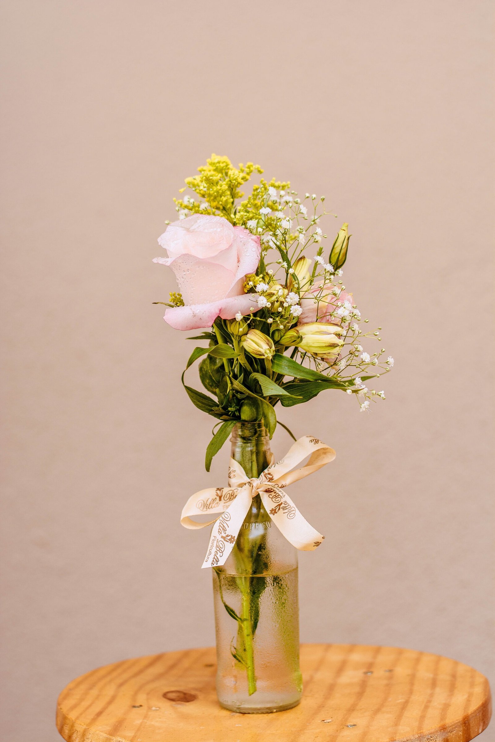 Garrafinha de vidro com uma rosa e mix de flores (Escolha a cor da rosa)