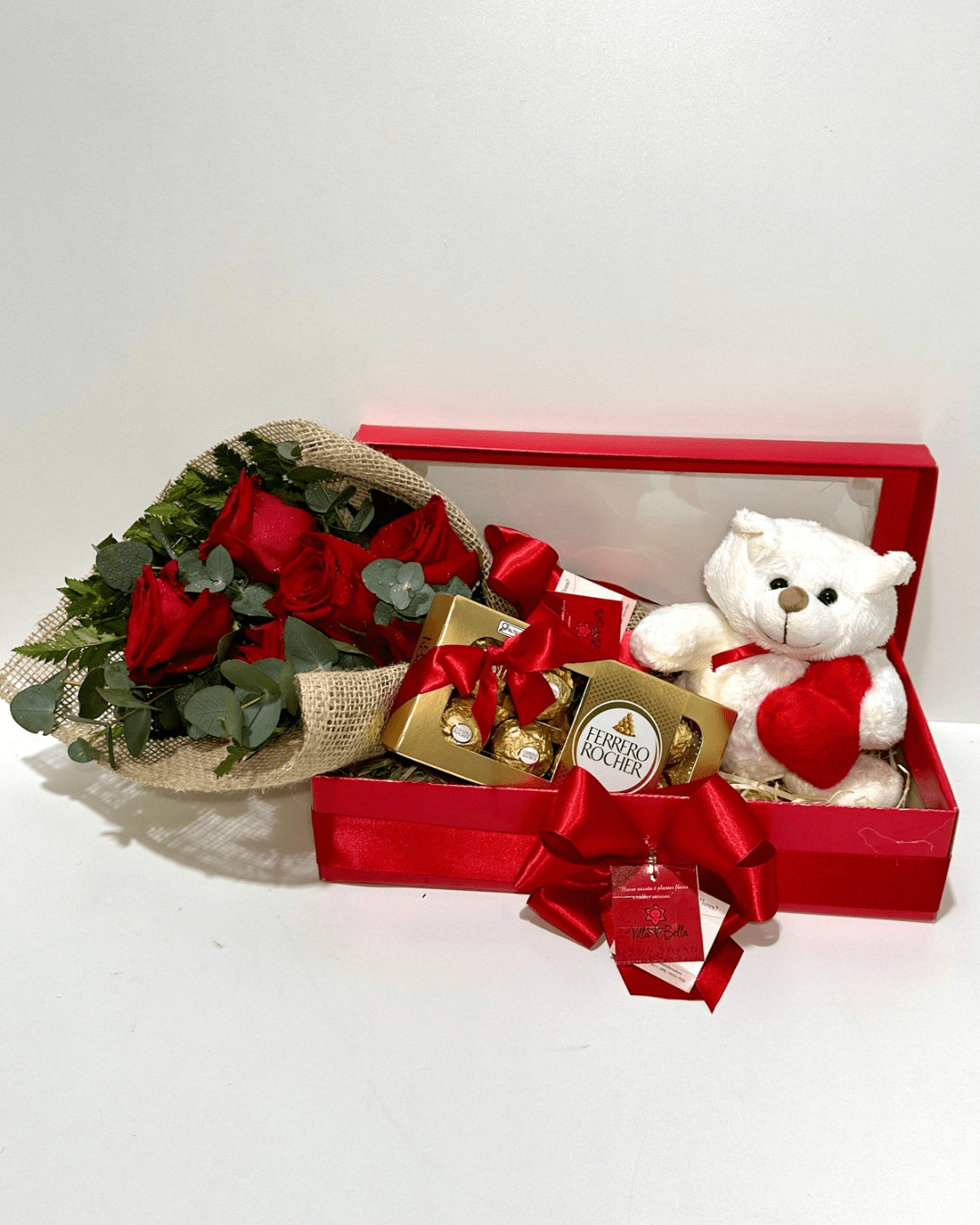 Caixa presente com Ramalhete com 4 rosas, 1 pelúcia e ferrero rocher com 8 unidades.